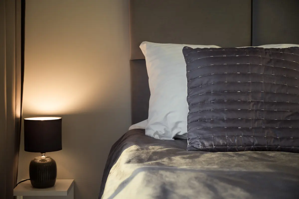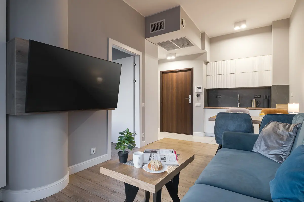 Hanza Tower to jedno z tych miejsc w Szczecinie, które najlepiej prezentuje się, gdy miasto zaczyna mienić się światłami. Podczas ostatniej realizacji w tym budynku, klient słusznie zasugerował, abyśmy rozpoczęli sesję bliżej zachodu słońca. To był doskonały punkt wyjścia, ponieważ niskie, złote światło pięknie wydobyło fakturę welurowej kanapy i ociepliło nowoczesne wnętrze. Postanowiłem jednak pójść o krok dalej i zaproponowałem, abyśmy zostali w apartamencie nieco dłużej, by uchwycić również ujęcia po zachodzie słońca. Dzięki temu materiał stał się bardziej różnorodny i dynamiczny. W momencie, gdy niebo za oknem przybrało głęboki, atramentowy odcień niebieskiej godziny, wnętrze zyskało zupełnie nowy, luksusowy charakter. Kontrast między chłodem nocy za oknem a ciepłym, punktowym oświetleniem salonu i sypialni stworzył klimat, który idealnie trafia w gusta gości szukających prestiżowego miejsca na nocleg w sercu Szczecina.